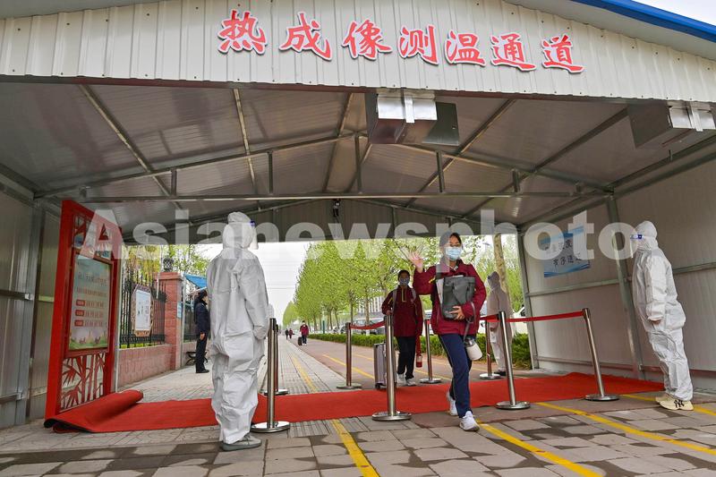 图片说明:2022年4月13日,山东省青州市圣水学校初中三年级学生经过热成像测温通道进入校园。