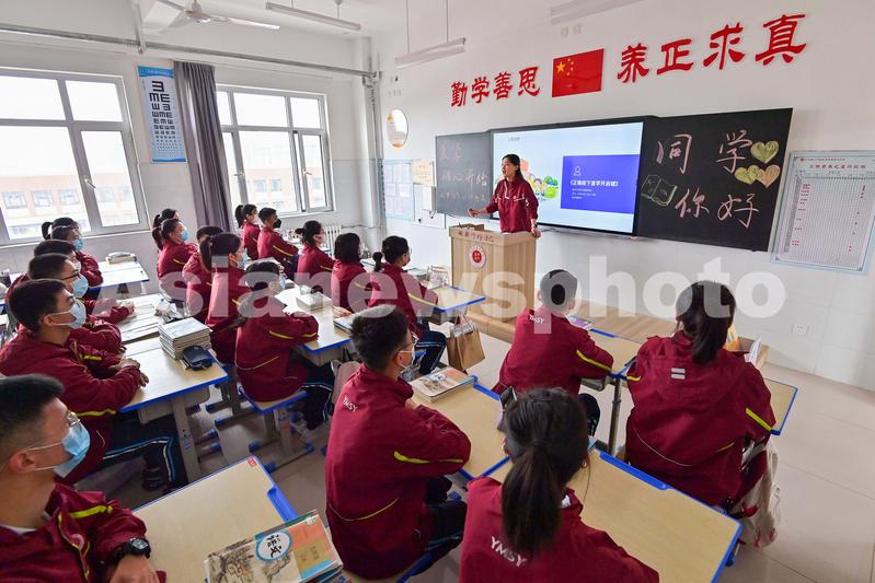 图片说明:2022年4月13日,山东省青州市圣水学校初中三年级老师在给学生上开学第一课。