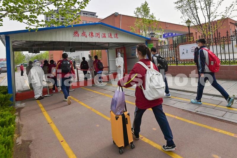 图片说明:2022年4月13日,山东省青州市圣水学校初中三年级学生经过热成像测温通道进入校园。