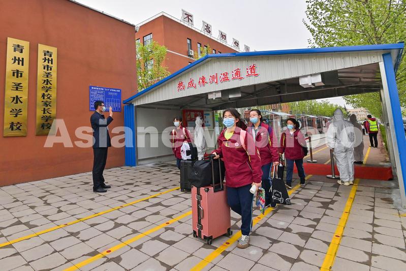 图片说明:2022年4月13日,山东省青州市圣水学校初中三年级学生经过热成像测温通道进入校园。