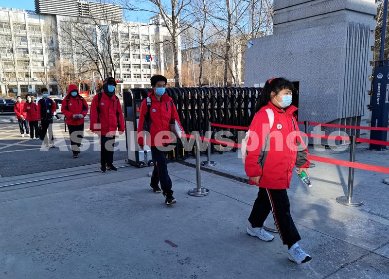 2022年4月15日,黑河市第四中学学生们间隔有序排队进入校园。
