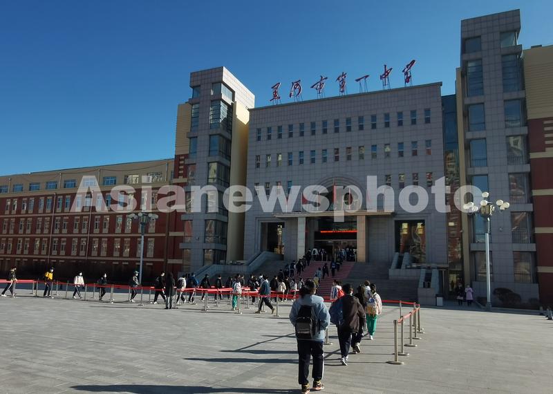 2022年4月15日,黑河市第一中学学生们间隔有序排队进入教学楼。