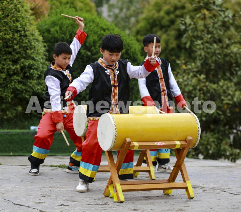 2022年4月18日,学生在贵州省黔西市新仁苗族乡新仁小学操场练习打鼓。