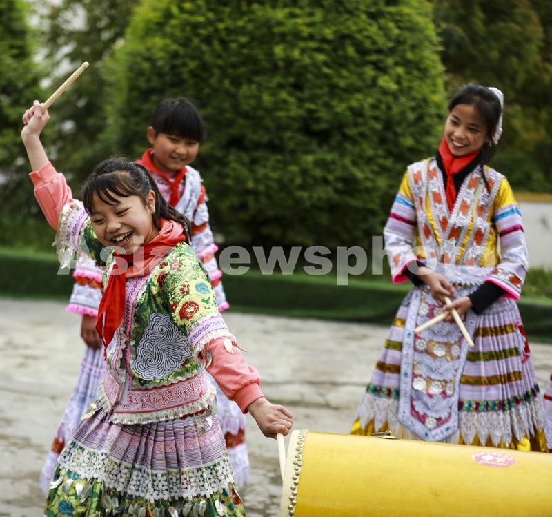 2022年4月18日,贵州省黔西市新仁苗族乡新仁小学学生在老师的带领下操场练习打鼓、吹芦笙和打鼓芦笙舞。