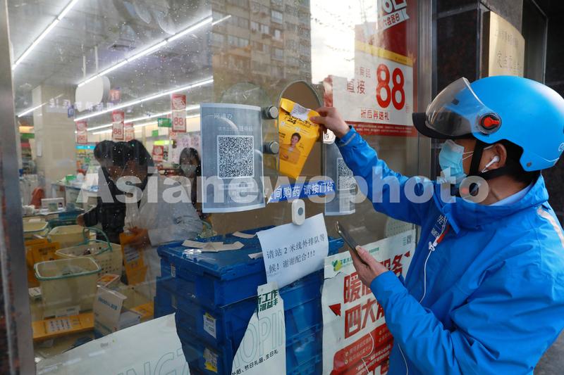 4月17日晚,在上海市黄浦区一家药店,外卖小哥在取药品。