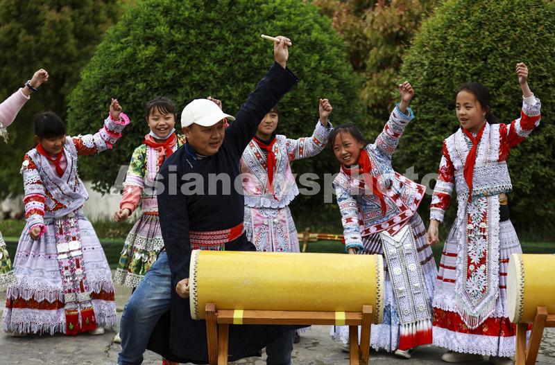 2022年4月18日,贵州省黔西市新仁苗族乡新仁小学学生在老师的带领下操场练习打鼓、吹芦笙和打鼓芦笙舞。