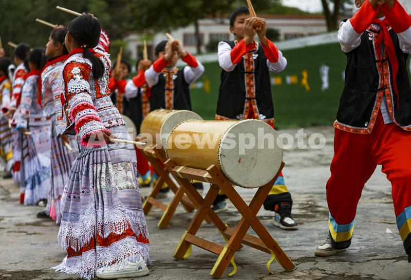 2022年4月18日,学生在贵州省黔西市新仁苗族乡新仁小学操场练习打鼓芦笙舞。