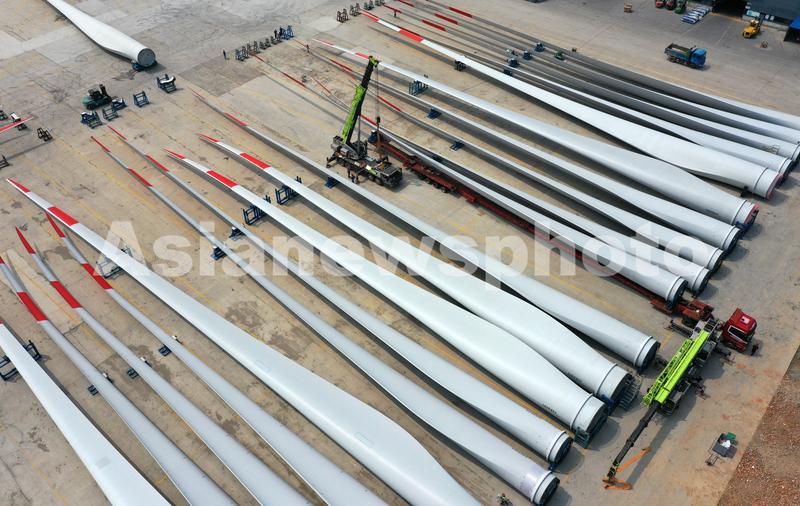 图片说明:2022年4月19日,江苏大丰经济开发区,无人航拍江苏双瑞风电叶片生产的场地上,工人正在将自主研制10兆瓦海上风电叶片吊装上车,运送给海上装机用户。