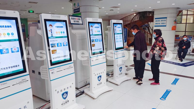图片说明:2022年4月19日,上海疫情形势复杂多变,复旦大学附属中山医院门诊、急诊正逐步开放,挂号缴费签到、查询账单、获取治疗报告都可通过智能机器自助,减少人与人的接触。
