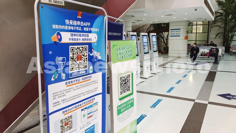 图片说明:2022年4月19日,上海疫情形势复杂多变,复旦大学附属中山医院门诊、急诊正逐步开放,随申办APP医保电子凭证、微信公众号宣传可提供部分远程医疗服务。