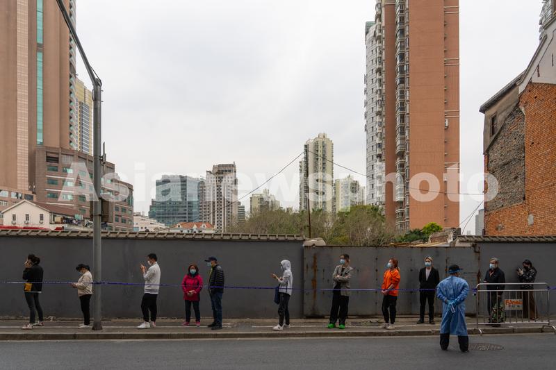 图片说明:3月30日下午,上海市黄浦区新昌路上,保持一米安全距离的市民等候进入政府临时开设的购物点内选购食物。