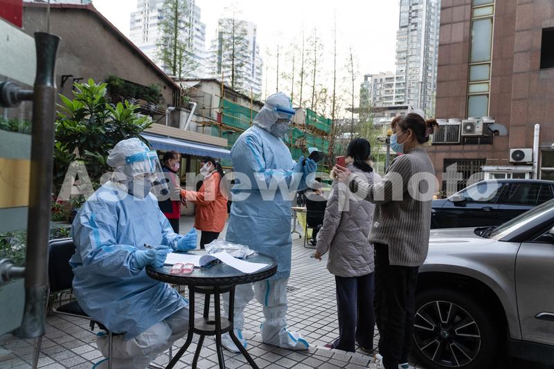 图片说明:4月5日,上海浦西长宁区一小区内,居民在接受核酸检测采样前登记信息。