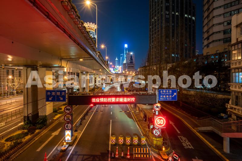 图片说明:3月28日晚,通往浦东的延安东路隧道口显示封控,只有能出示通行证的车辆才能由此驶往浦东。
