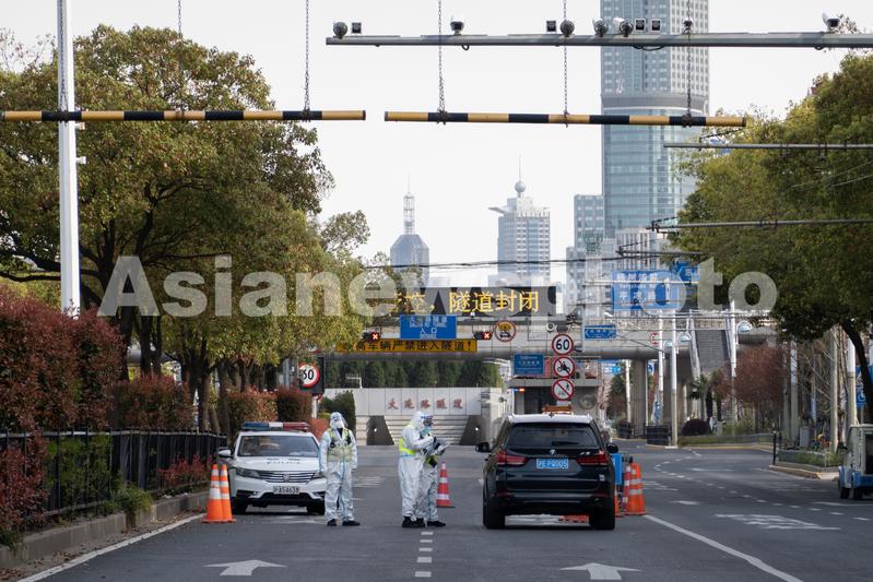 图片说明:2022年3月28日,上海,当天下午,杨浦区大连路隧道入口处,通往浦东的隧道已显示封闭状态,有防疫人员现场把守,确有通行需求的车辆需出示通行证并登记。