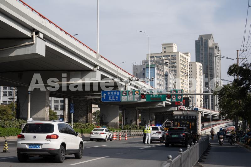 图片说明:2022年3月28日,上海,当天下午,杨浦区黄兴路杨浦大桥入口处,通往浦东的高架桥显示封闭状态,有防疫人员现场把守,确有通行需求的车辆需出示通行证并登记。