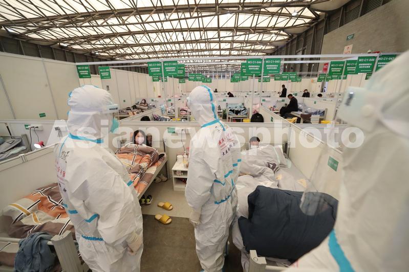 4月9日,在上海新国际博览中心方舱医院,武汉大学中南医院援沪医疗队在进行查房。