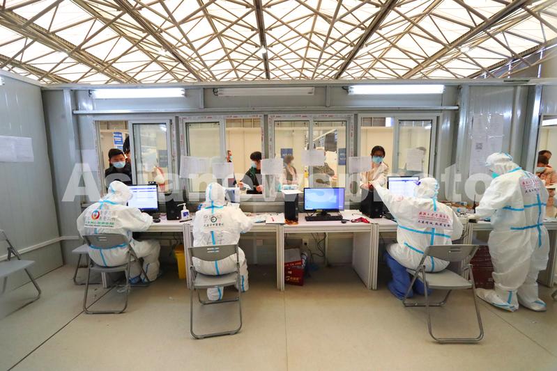 4月9日,感染者在上海新国际博览中心方舱医院护士站向医生咨询。