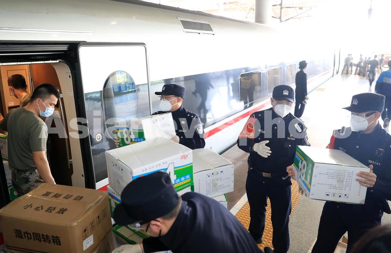 图片说明:2022年4月7日,武汉站,公安民警帮助援沪医护人员搬运物资。