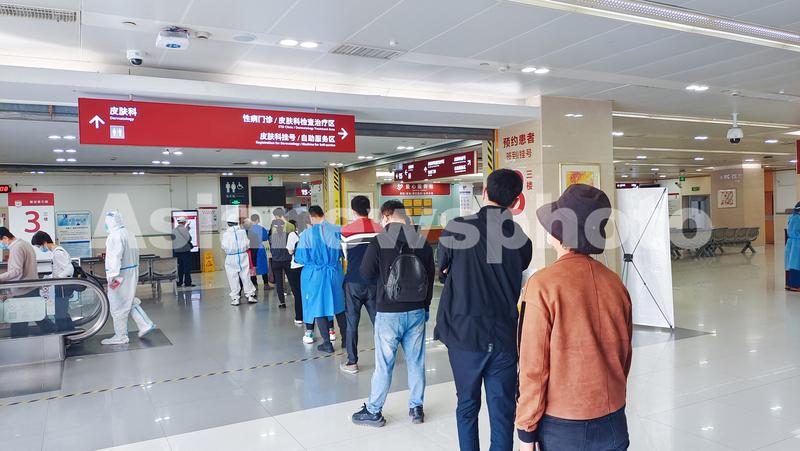 图片说明:2022年4月22日,上海,新冠疫情形势复杂多变,复旦大学附属华山医院已经有限开放门诊急诊医疗服务。患者排队等待就诊。