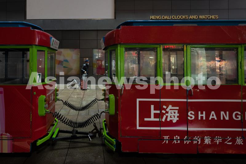 图片说明:3月31日晚,上海浦西封控前,一位市民拖着行李箱在上海南京东路步行街上走过。