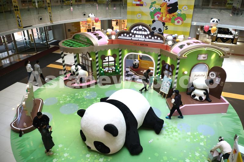 2022年4月25日,辽宁沈阳,妙趣熊猫屋,熊猫滚滚PandaRoll展亮相一商场,吸引市民参观。