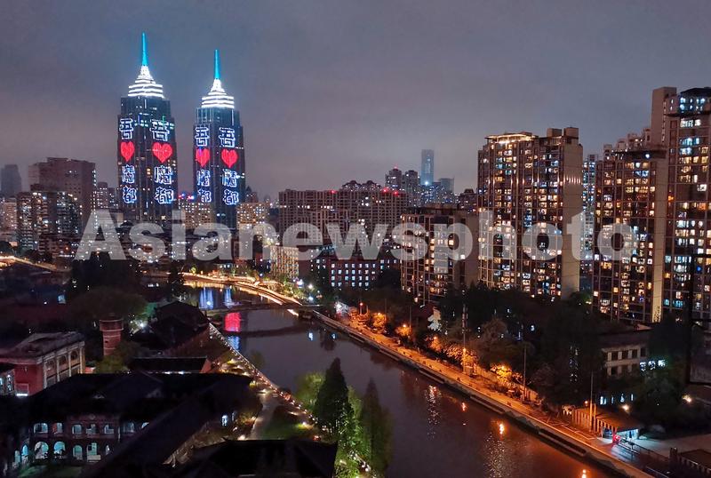 近日,上海新冠病毒疫情防控形势严峻,地标建筑环球港双子楼灯光秀点亮苏州河畔夜景为抗疫加油,“我爱魔都”、“上海加油,爱在一起”、“静候春暖花开”字样代表了市民的心声和渴望春天的美好祝福。