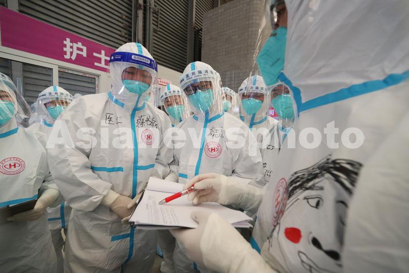 4月9日,武汉大学中南医院副院长、援沪医疗队领队李志强(中)、主治医生蔡书翰和同事们在进行交接班信息核对。