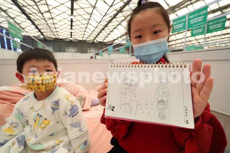 4月9日,在上海新国际博览中心方舱医院,儿童感染者郭贞希展示自己手绘漫画表达对援沪医疗队的感谢。