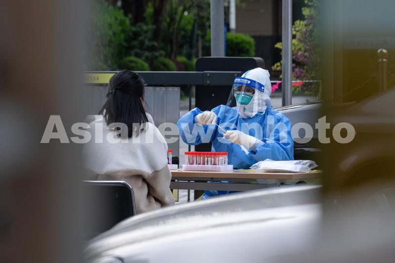 图片说明:4月5日,上海浦西长宁区一小区内,居民接受核酸检测采样。