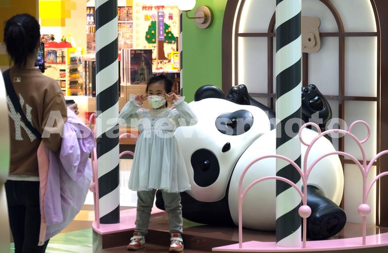 2022年4月25日,辽宁沈阳,妙趣熊猫屋,熊猫滚滚PandaRoll展亮相一商场,吸引市民参观。