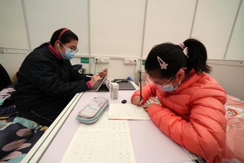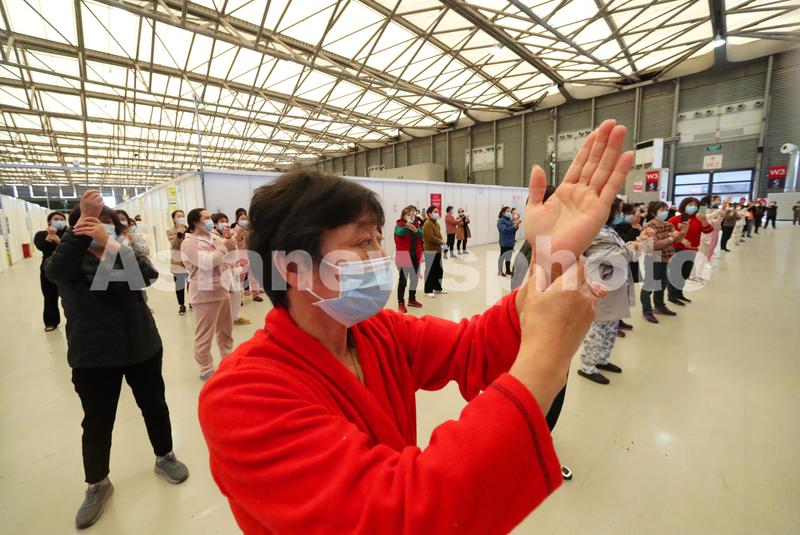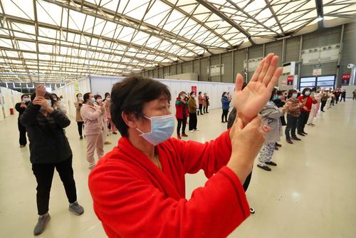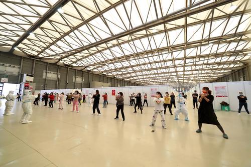 4月9日,在上海新国际博览中心方舱医院,感染者在休息间隙练习八段锦。