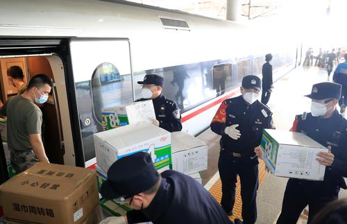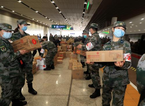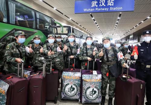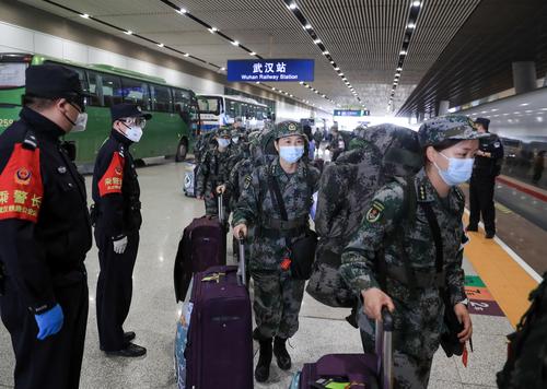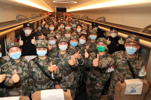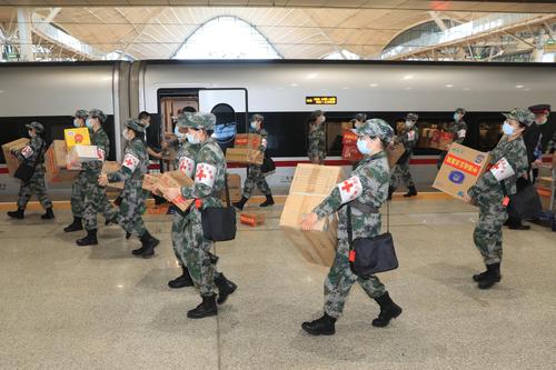 图片说明:2022年4月7日,武汉站,解放军中部战区驻湖北武汉军队抽调的医护人员准备乘坐G600次高铁列车前往支援上海,参加上海疫情防控工作。