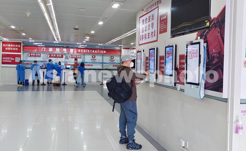图片说明:2022年4月22日,上海,新冠疫情形势复杂多变,复旦大学附属华山医院已经有限开放门诊急诊医疗服务。医院内众多挂号服务自助机器可以避免人与人之间的接触。