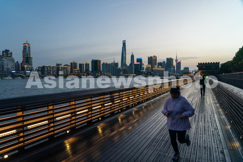 图片说明:3月28日,浦东封控首日,傍晚,市民在位于浦西的杨浦滨江慢跑健身。