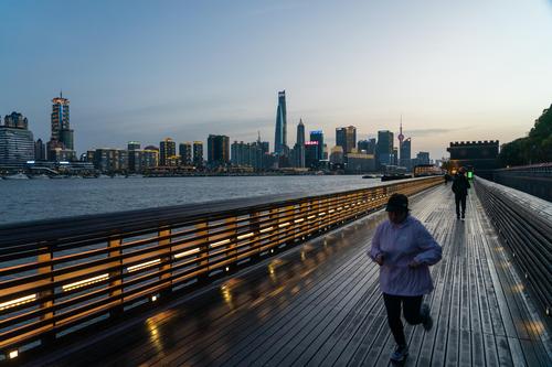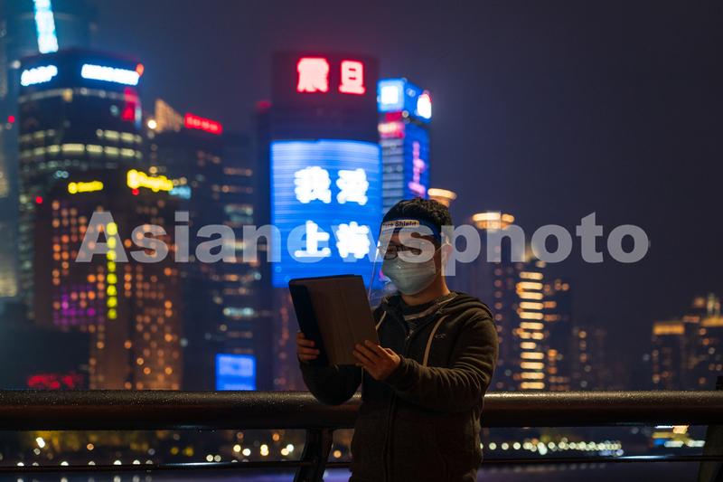 图片说明:3月31日晚,居住在上海杨浦的一位市民特地来到雨后外滩与封控前的浦西合影。