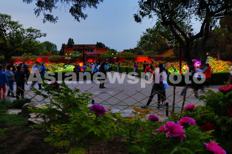 图片说明:2022年4月23日,北京景山公园"夜赏牡丹"景区内游客感受牡丹幻境。