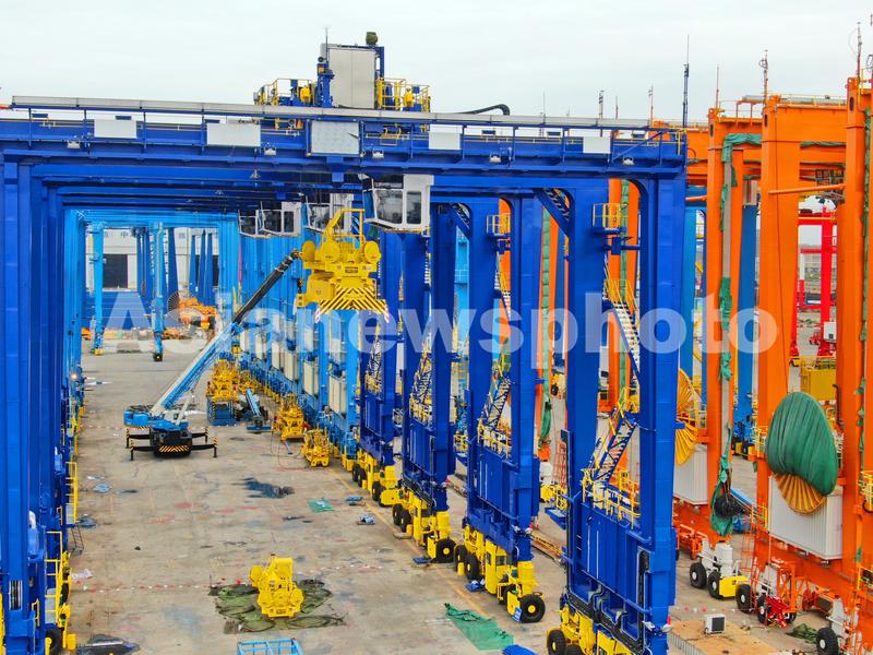 图片说明:2022年4月27日,在江苏南通振华重装大基地,上海振华重工南通分公司巴基斯坦轮胎吊、希腊轮胎吊、孟加拉轮胎吊等国内外轮胎吊调试现场十分壮观。