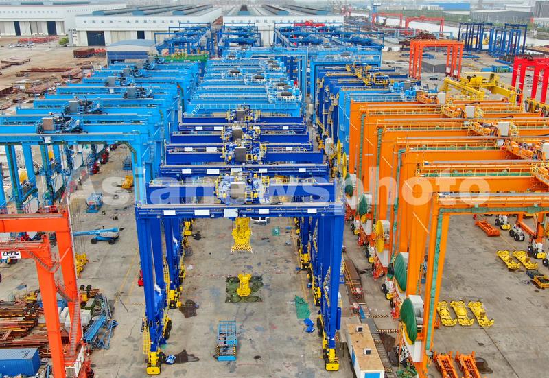 图片说明:2022年4月27日,在江苏南通振华重装大基地,上海振华重工南通分公司巴基斯坦轮胎吊、希腊轮胎吊、孟加拉轮胎吊等国内外轮胎吊调试现场十分壮观。