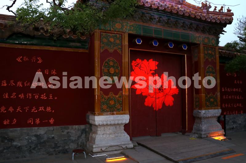 图片说明:2022年4月23日,北京景山公园红墙古树黄瓦相互映称,使游客在傍晚欣赏牡丹更添一份神秘与奇幻。