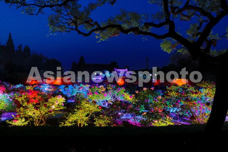 图片说明:2022年4月23日,北京景山公园"夜赏牡丹"景区内游客感受牡丹幻境。