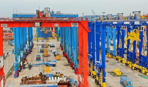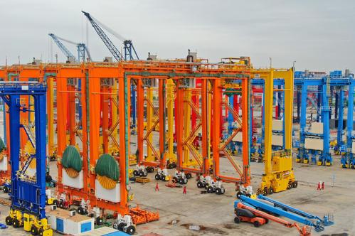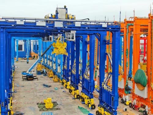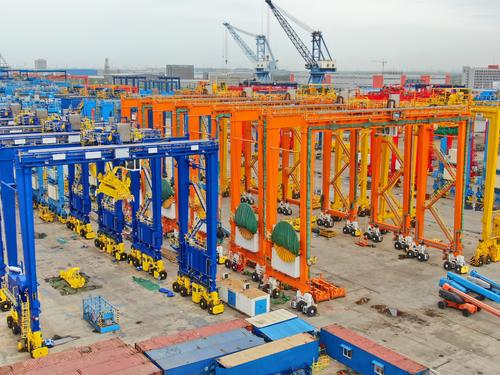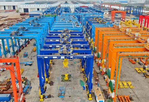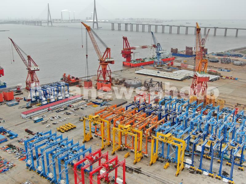 图片说明:2022年4月27日,在江苏南通振华重装大基地,上海振华重工南通分公司巴基斯坦轮胎吊、希腊轮胎吊、孟加拉轮胎吊等国内外轮胎吊调试现场十分壮观。