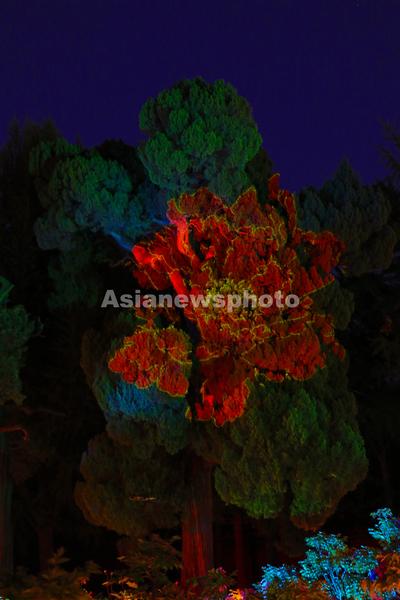 图片说明:2022年4月23日,北京景山公园"夜赏牡丹"景区内游客感受牡丹幻境。