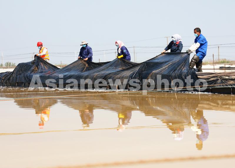 2022年5月5日,连云港市工投集团日晒制盐公司新河分公司,工人在即将开扒的盐池里清理塑料布。