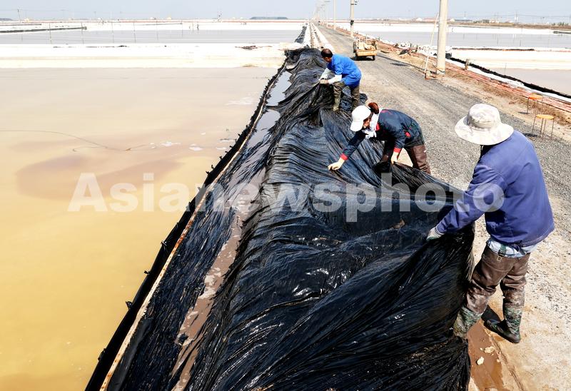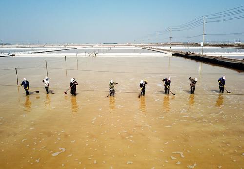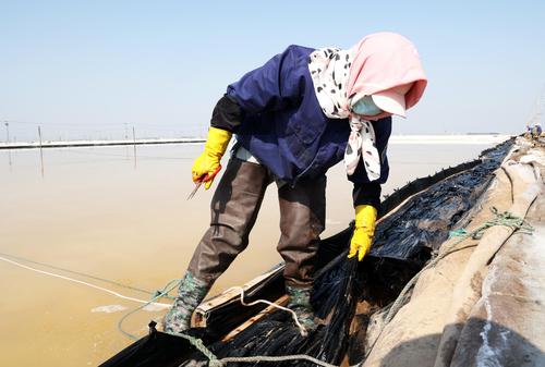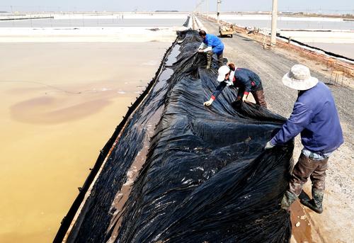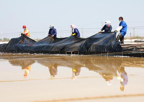 2022年5月5日,连云港市工投集团日晒制盐公司新河分公司,工人在即将开扒的盐池里清理塑料布。