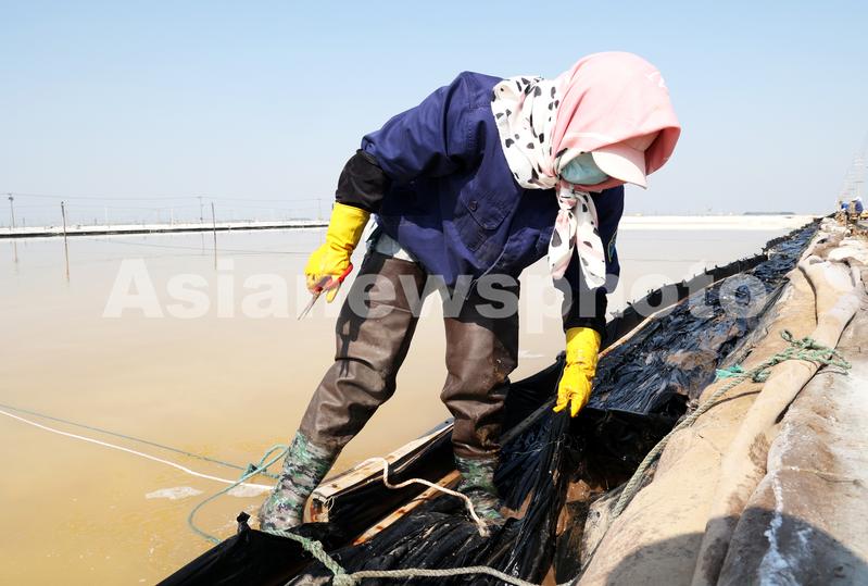 2022年5月5日,连云港市工投集团日晒制盐公司新河分公司,工人在即将开扒的盐池里清理塑料布。