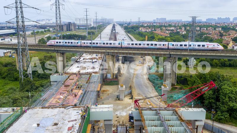 2022年5月6日,海南省海口市G15沈海高速公路海口段,在粤海大道与南海大道交汇处施工正酣,动车从上方驶过。