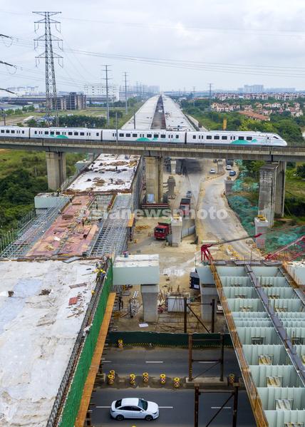 2022年5月6日,海南省海口市G15沈海高速公路海口段,在粤海大道与南海大道交汇处施工正酣,动车从上方驶过。