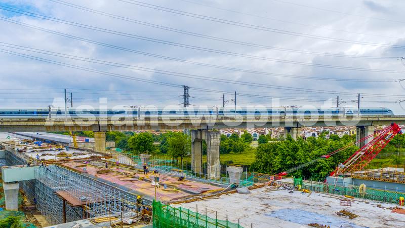 2022年5月6日,海南省海口市G15沈海高速公路海口段,在粤海大道与南海大道交汇处施工正酣,动车从上方驶过。