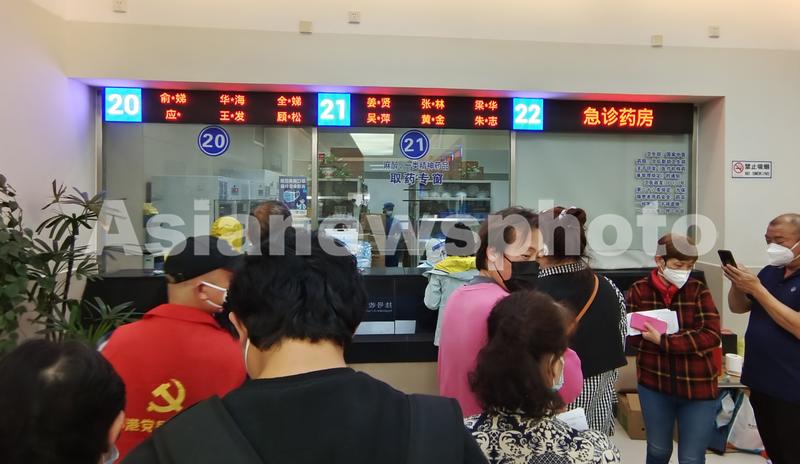 图片说明:2022年5月4日,上海,为切实解决群众就医需求,复旦大学附属中山医院全面复工所有类型门诊和急诊服务(包括高级专家门诊)。图为众多市民在配药处排队取药。