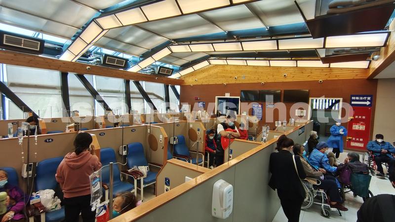 图片说明:2022年5月4日,上海,为切实解决群众就医需求,复旦大学附属中山医院全面复工所有类型门诊和急诊服务(包括高级专家门诊)。图为众多市民在输液室接受吊针治疗。